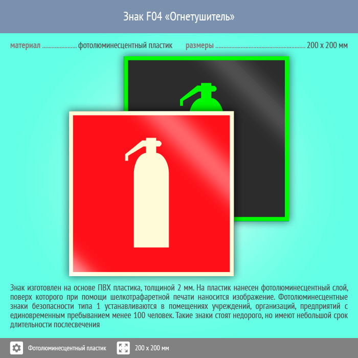 Знак F04 «Огнетушитель» (фотолюминесцентный пластик, 200х200 мм) в Краснодаре купить