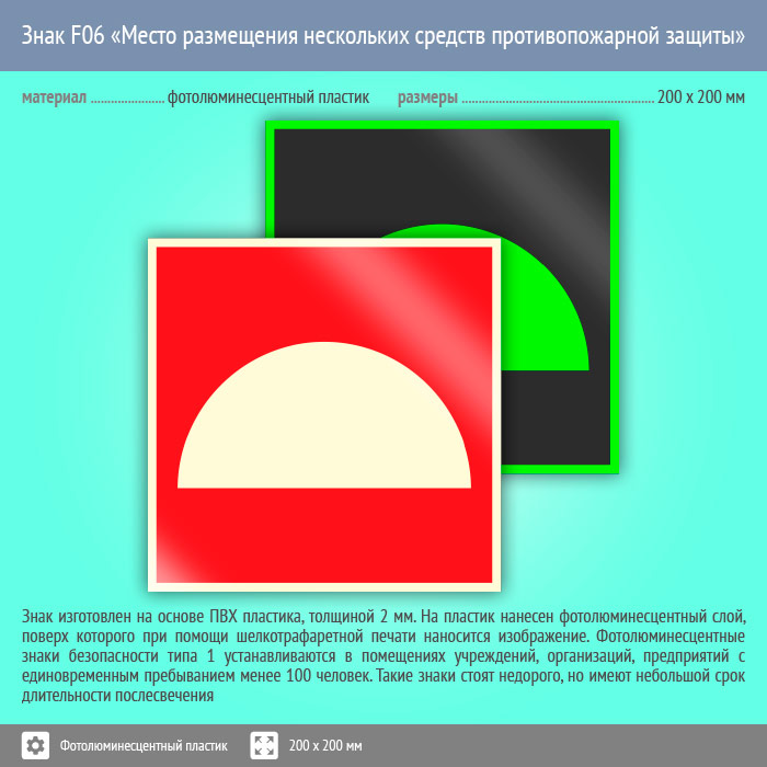 Знак F06 «Место размещения нескольких средств противопожарной защиты» (фотолюминесцентный пластик, 200х200 мм) в Краснодаре купить