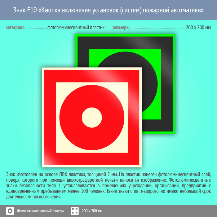Знак F10 «Кнопка включения установок (систем) пожарной автоматики» (фотолюминесцентный пластик, 200х200 мм) в Краснодаре купить