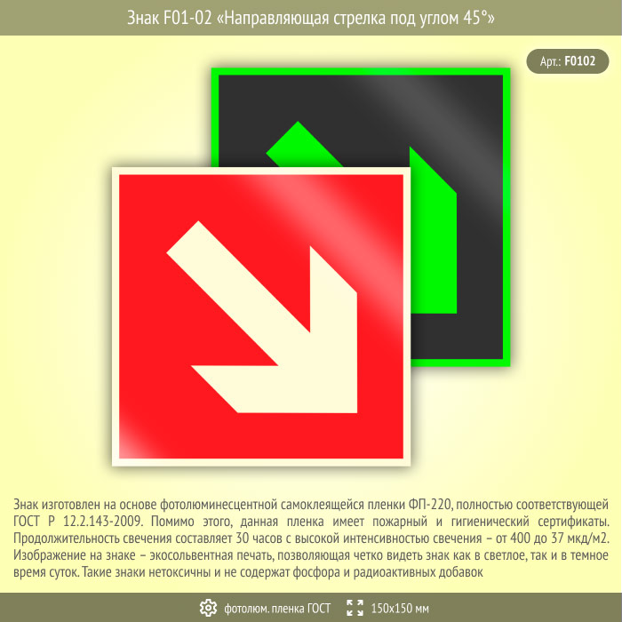 Знак F01-02 «Направляющая стрелка под углом 45°» (фотолюминесцентная пленка ГОСТ 34428-2018, 150х150 мм) в Краснодаре купить