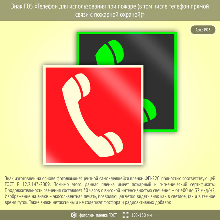Знак F05 «Телефон для использования при пожаре (в том числе телефон прямой связи с пожарной охраной)» (фотолюминесцентная пленка ГОСТ 34428-2018, 150х150 мм) в Краснодаре купить