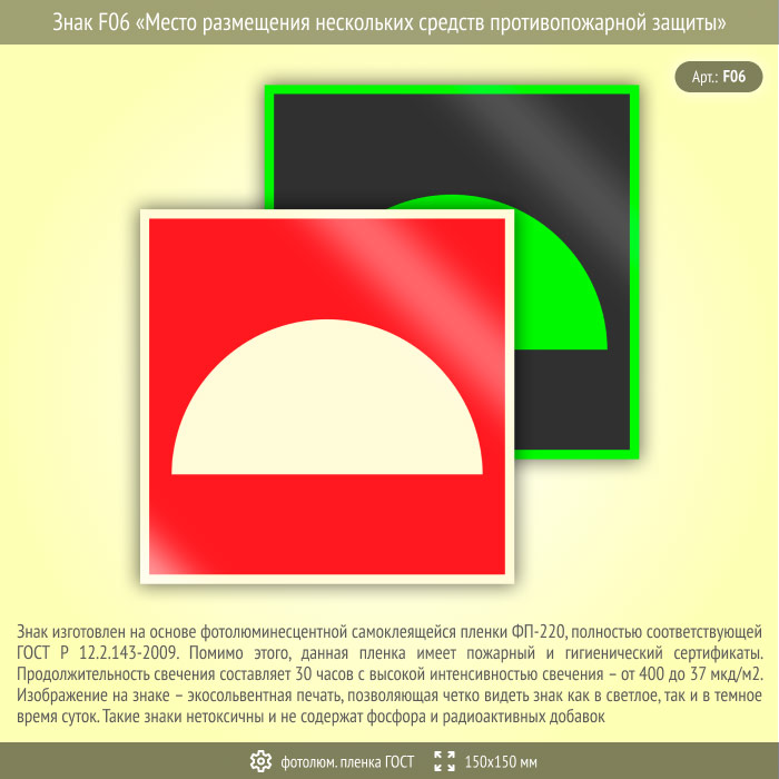 Знак F06 «Место размещения нескольких средств противопожарной защиты» (фотолюминесцентная пленка ГОСТ 34428-2018, 150х150 мм) в Краснодаре купить