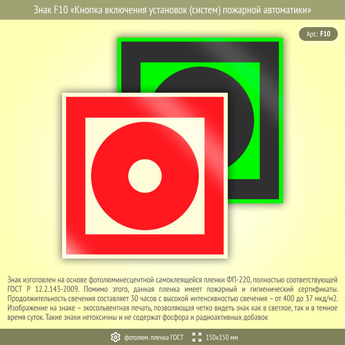 Знак F10 «Кнопка включения установок (систем) пожарной автоматики» (фотолюминесцентная пленка ГОСТ 34428-2018, 150х150 мм) в Краснодаре купить