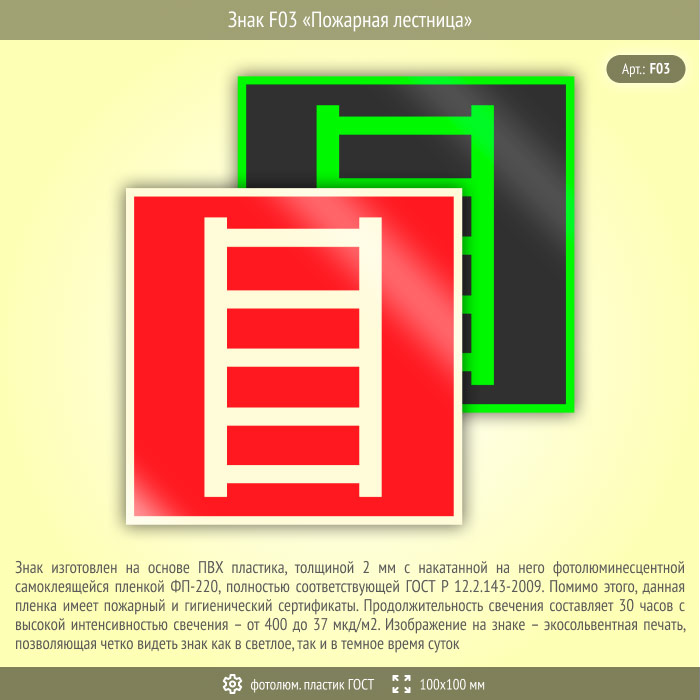 Знак F03 «Пожарная лестница» (фотолюминесцентный пластик ГОСТ 34428-2018, 100х100 мм) в Краснодаре купить