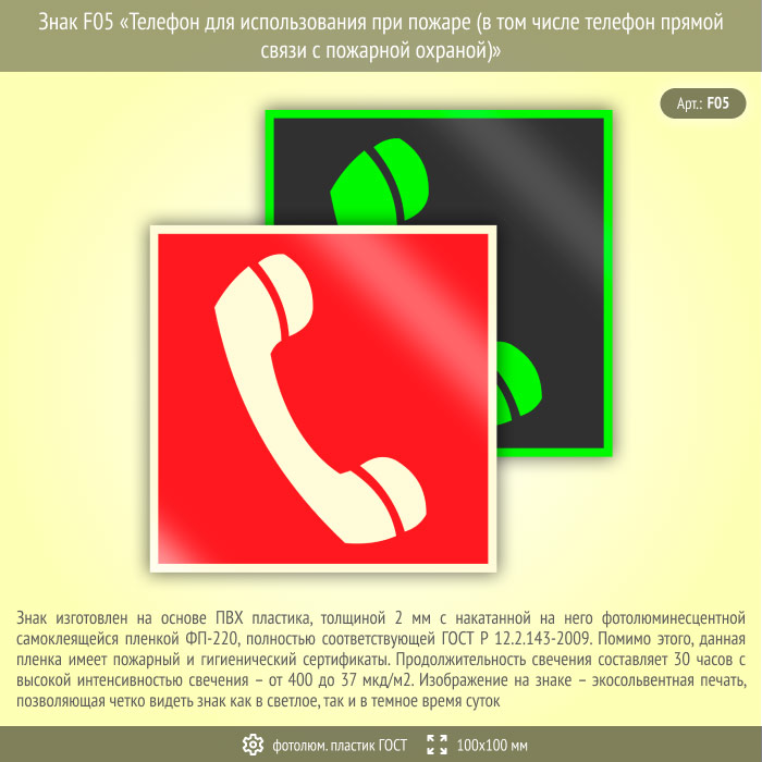 Знак F05 «Телефон для использования при пожаре (в том числе телефон прямой связи с пожарной охраной)» (фотолюминесцентный пластик ГОСТ 34428-2018, 100х100 мм) в Краснодаре купить