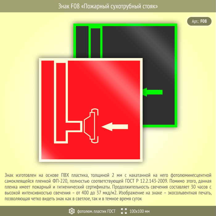 Знак F08 «Пожарный сухотрубный стояк» (фотолюминесцентный пластик ГОСТ 34428-2018, 100х100 мм) в Краснодаре купить