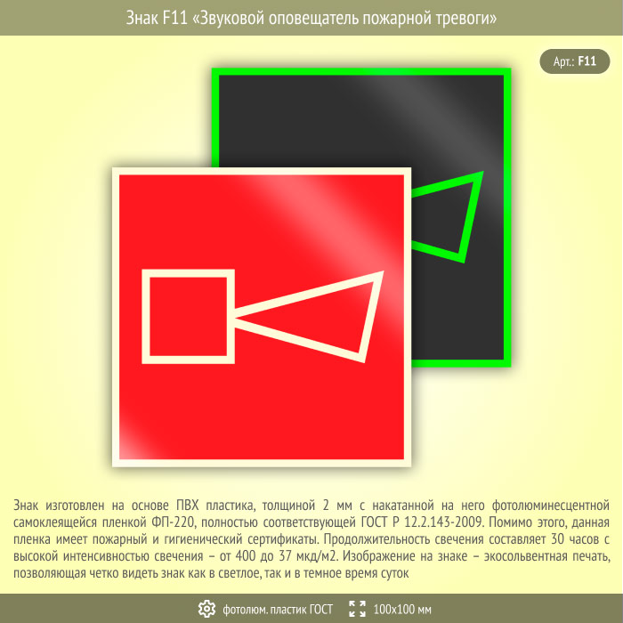 Знак F11 «Звуковой оповещатель пожарной тревоги» (фотолюминесцентный пластик ГОСТ 34428-2018, 100х100 мм) в Краснодаре купить