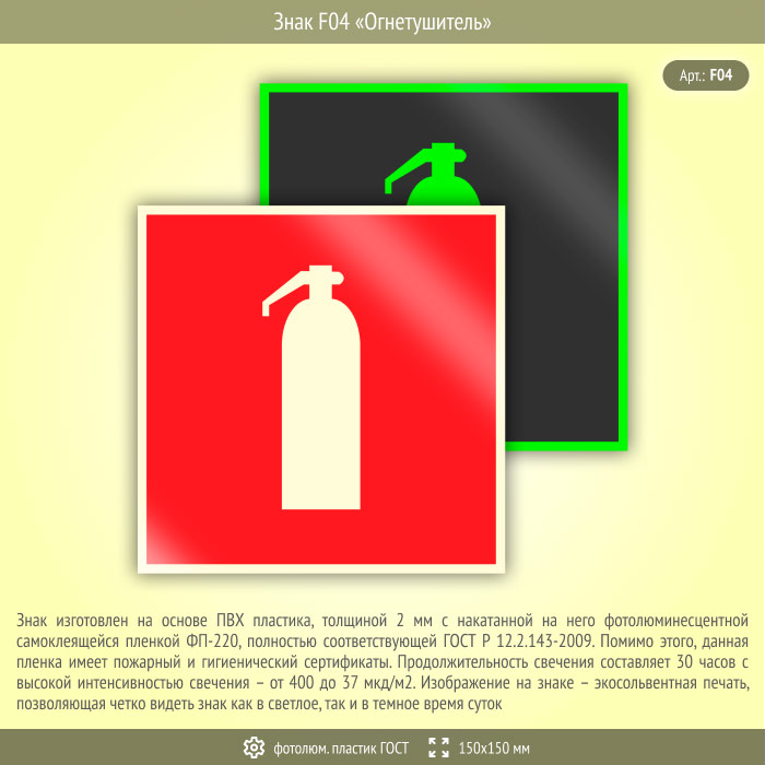 Знак F04 «Огнетушитель» (фотолюминесцентный пластик ГОСТ 34428-2018, 150х150 мм) в Краснодаре купить