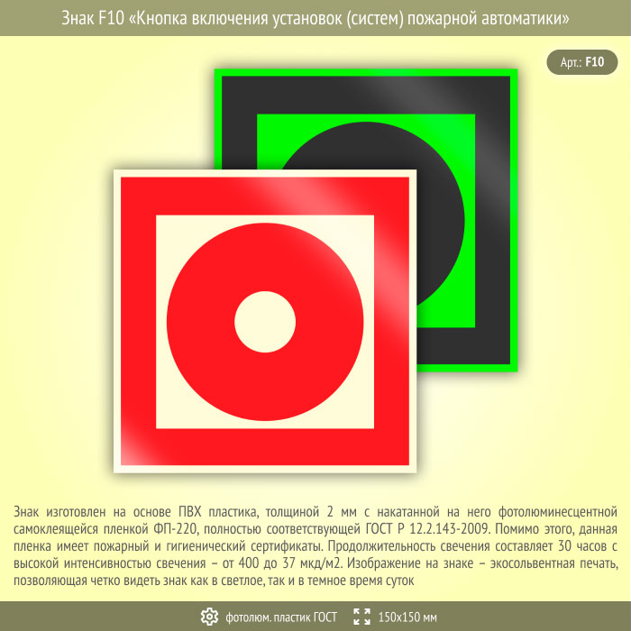 Знак F10 «Кнопка включения установок (систем) пожарной автоматики» (фотолюминесцентный пластик ГОСТ 34428-2018, 150х150 мм) в Краснодаре купить