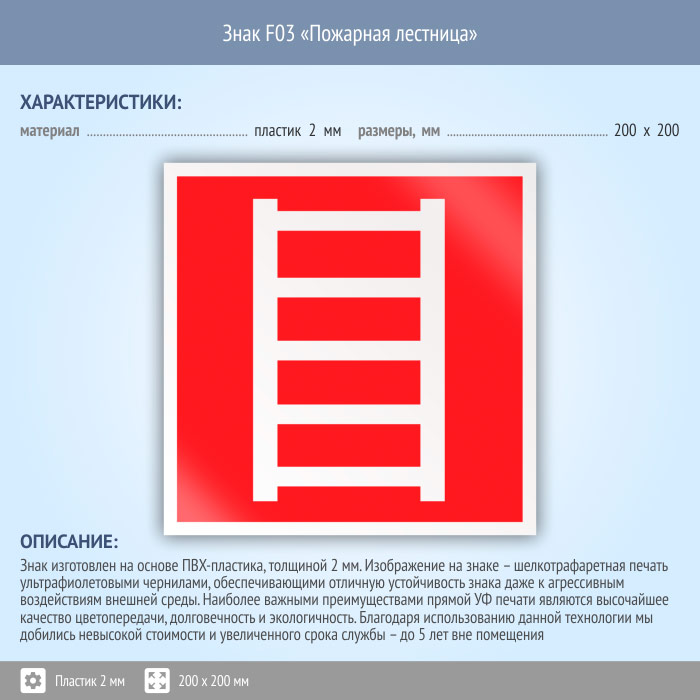 Знак F03 «Пожарная лестница» (пластик, 200х200 мм) в Краснодаре купить