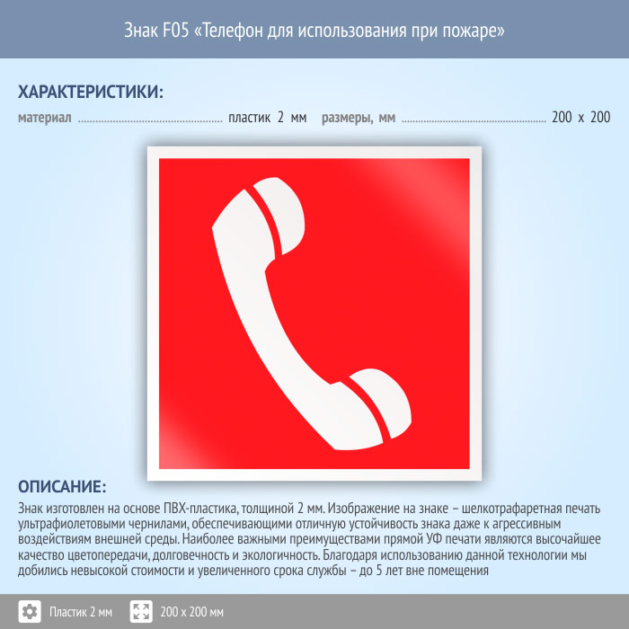 Знак F05 «Телефон для использования при пожаре (в том числе телефон прямой связи с пожарной охраной)» (пластик, 200х200 мм) в Краснодаре купить