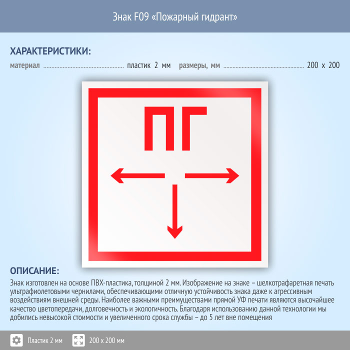 Знак F09 «Пожарный гидрант» (пластик, 200х200 мм) в Краснодаре купить