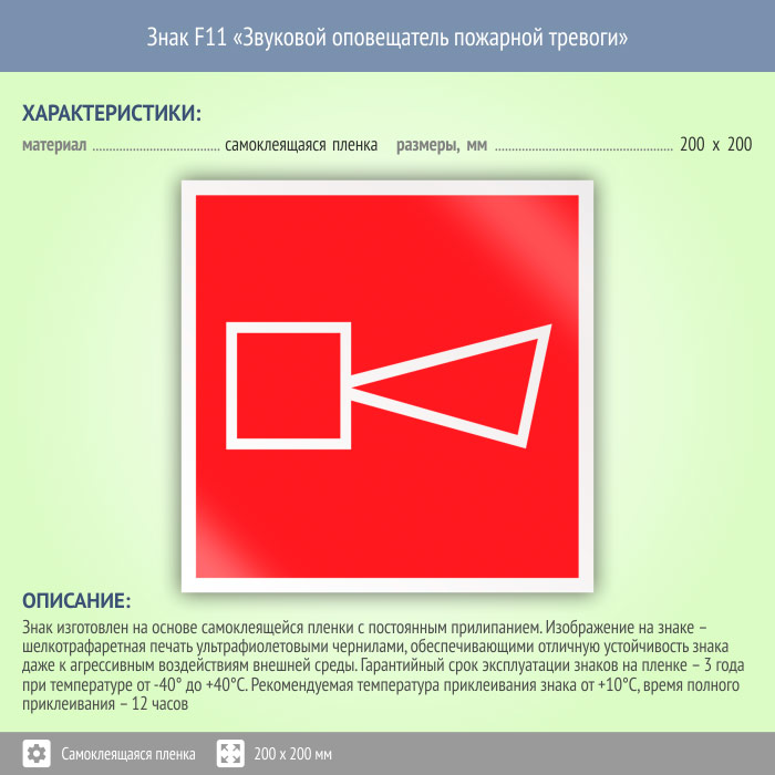 Знак F11 «Звуковой оповещатель пожарной тревоги» (пленка, 200х200 мм) в Краснодаре купить