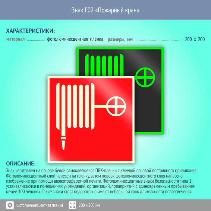 Знак F02 «Пожарный кран» (фотолюминесцентная пленка, 200х200 мм) в Краснодаре купить