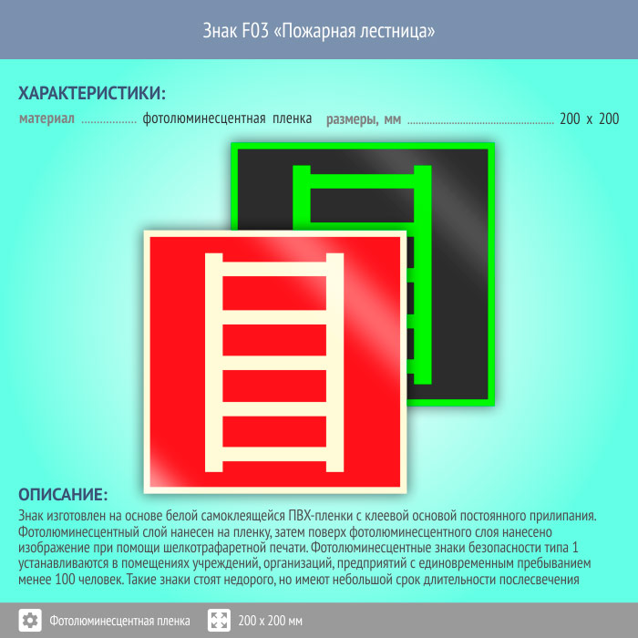 Знак F03 «Пожарная лестница» (фотолюминесцентная пленка, 200х200 мм) в Краснодаре купить