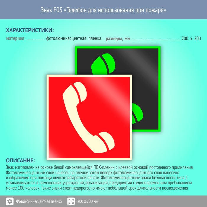 Знак F05 «Телефон для использования при пожаре (в том числе телефон прямой связи с пожарной охраной)» (фотолюминесцентная пленка, 200х200 мм) в Краснодаре купить