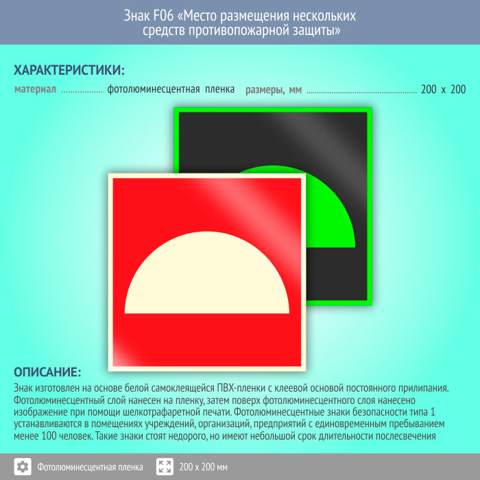 Знак F06 «Место размещения нескольких средств противопожарной защиты» (фотолюминесцентная пленка, 200х200 мм) в Краснодаре купить