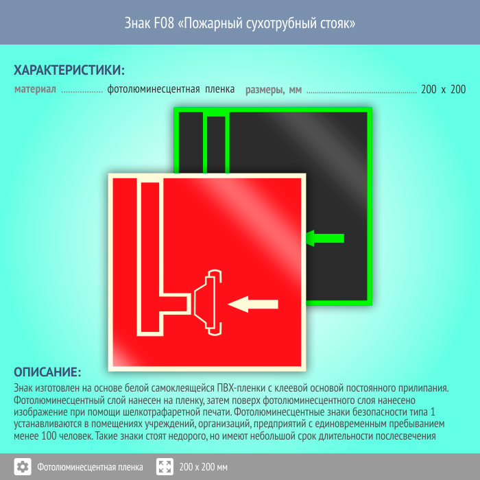 Знак F08 «Пожарный сухотрубный стояк» (фотолюминесцентная пленка, 200х200 мм) в Краснодаре купить