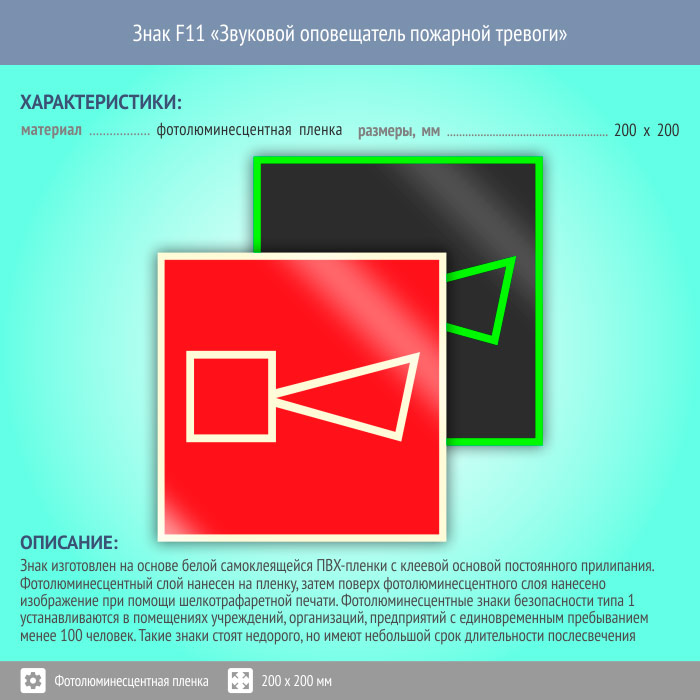 Знак F11 «Звуковой оповещатель пожарной тревоги» (фотолюминесцентная пленка, 200х200 мм) в Краснодаре купить