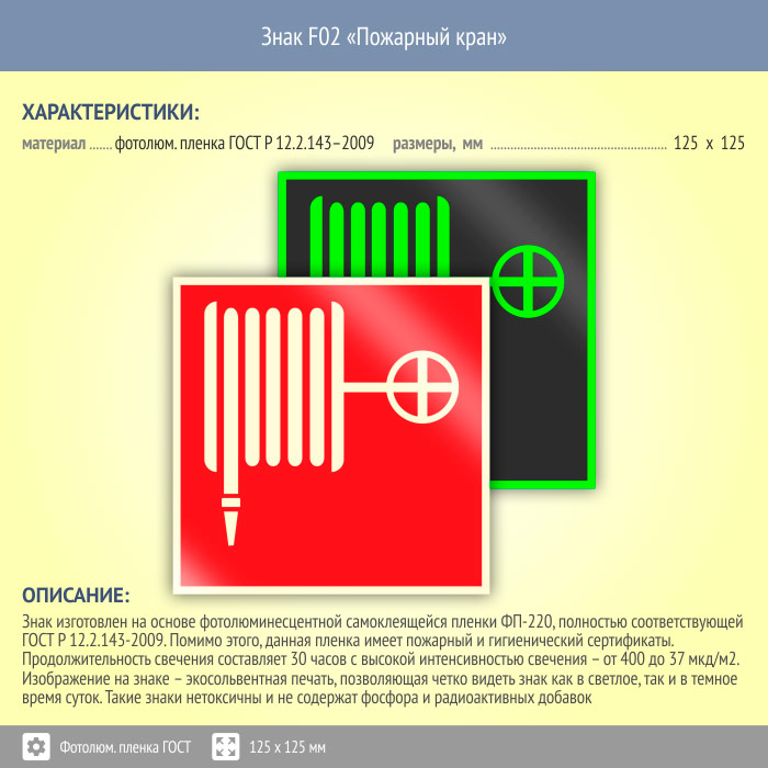 Знак F02 «Пожарный кран» (фотолюминесцентная пленка ГОСТ 34428-2018, 125х125 мм) в Краснодаре купить