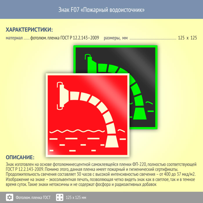 Знак F07 «Пожарный водоисточник» (фотолюминесцентная пленка ГОСТ 34428-2018, 125х125 мм) в Краснодаре купить