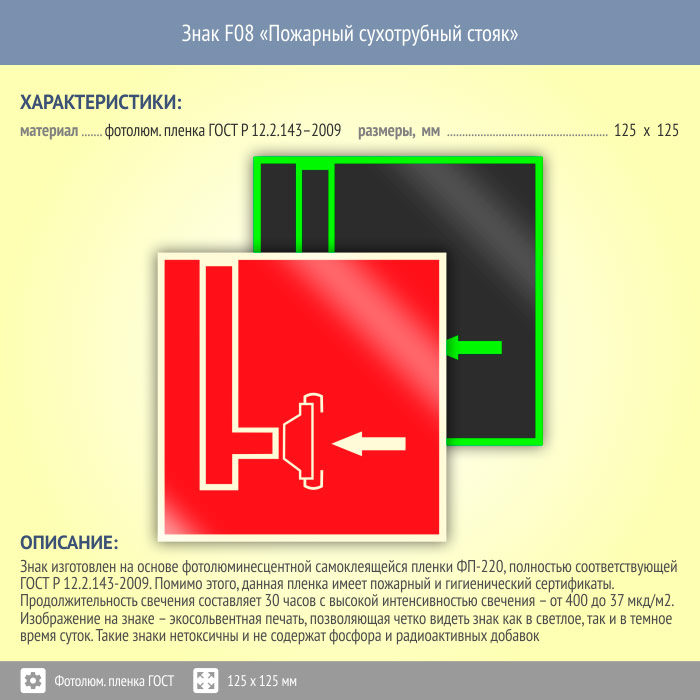 Знак F08 «Пожарный сухотрубный стояк» (фотолюминесцентная пленка ГОСТ 34428-2018, 125х125 мм) в Краснодаре купить