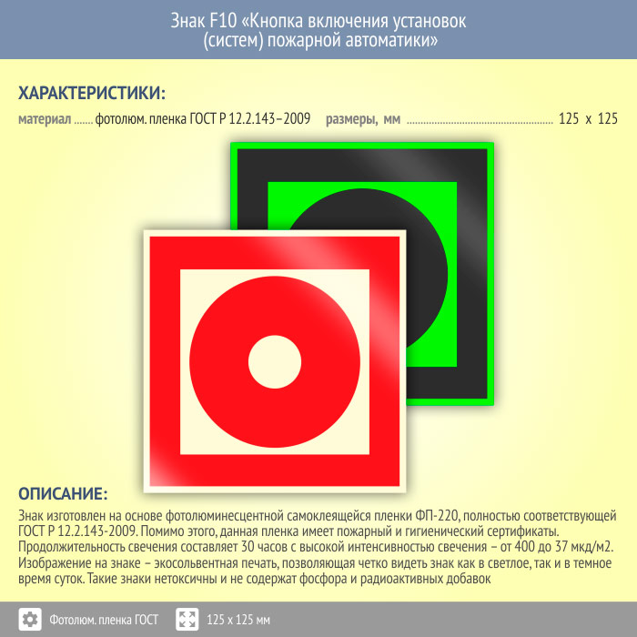 Знак F10 «Кнопка включения установок (систем) пожарной автоматики» (фотолюминесцентная пленка ГОСТ 34428-2018, 125х125 мм) в Краснодаре купить