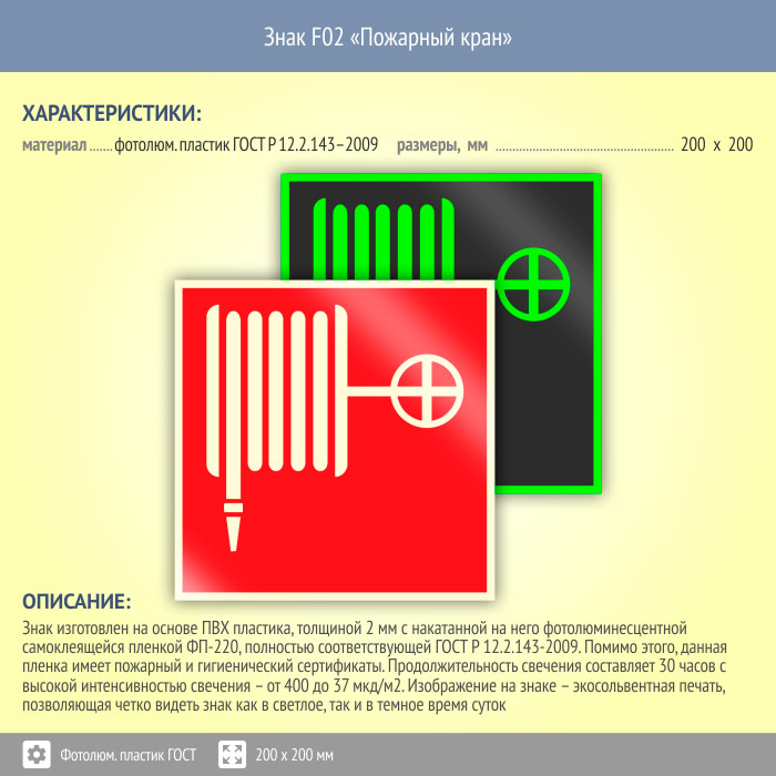 Знак F02 «Пожарный кран» (фотолюминесцентный пластик ГОСТ 34428-2018, 200х200 мм) в Краснодаре купить