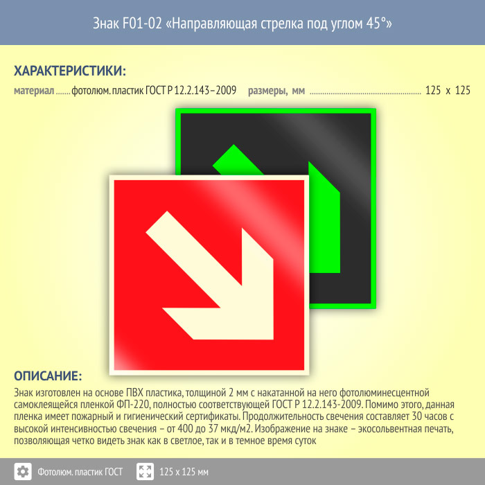 Знак F01-02 «Направляющая стрелка под углом 45°» (фотолюминесцентный пластик ГОСТ 34428-2018, 125х125 мм) в Краснодаре купить