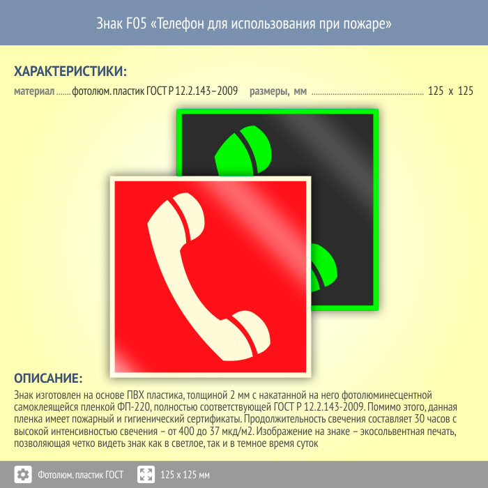 Знак F05 «Телефон для использования при пожаре (в том числе телефон прямой связи с пожарной охраной)» (фотолюминесцентный пластик ГОСТ 34428-2018, 125х125 мм) в Краснодаре купить