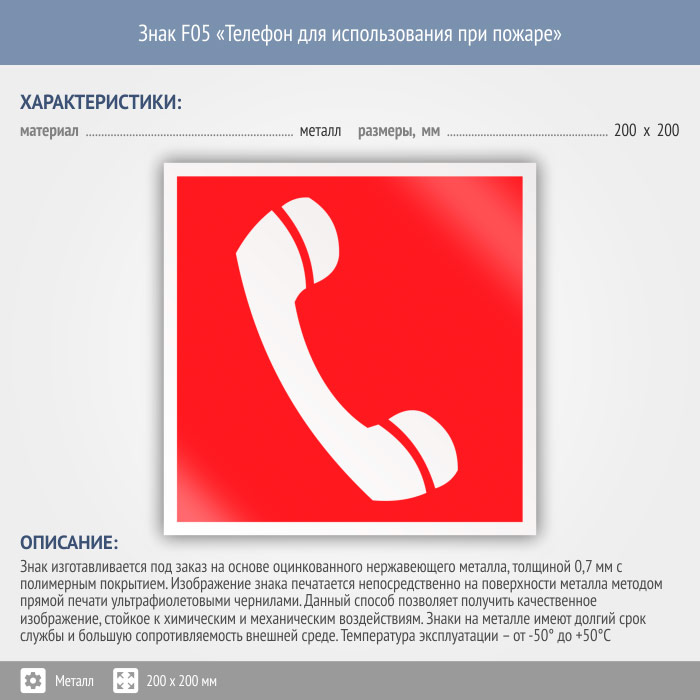 Знак F05 «Телефон для использования при пожаре (в том числе телефон прямой связи с пожарной охраной)» (металл, 200х200 мм) в Краснодаре купить