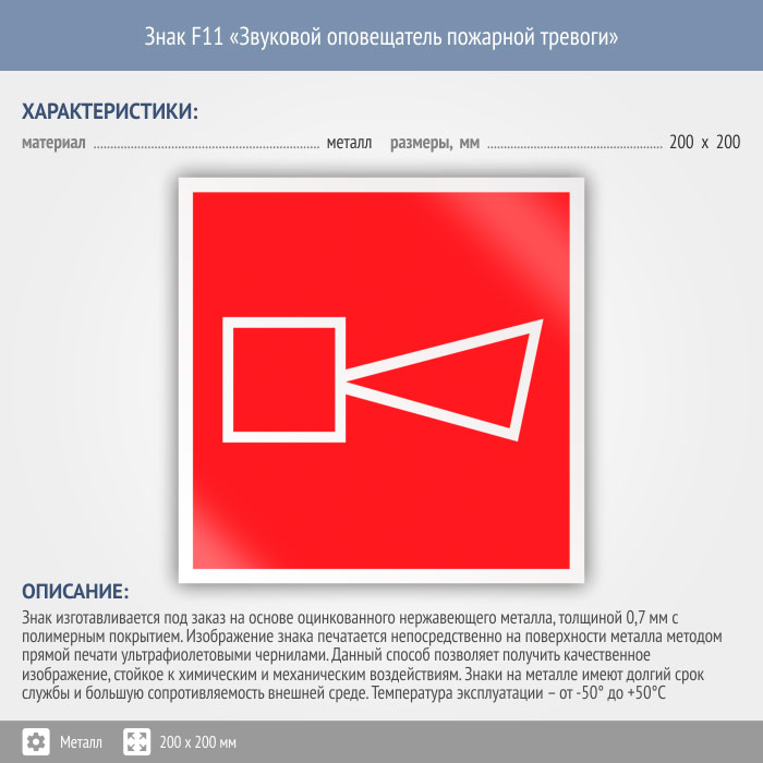 Знак F11 «Звуковой оповещатель пожарной тревоги» (металл, 200х200 мм) в Краснодаре купить